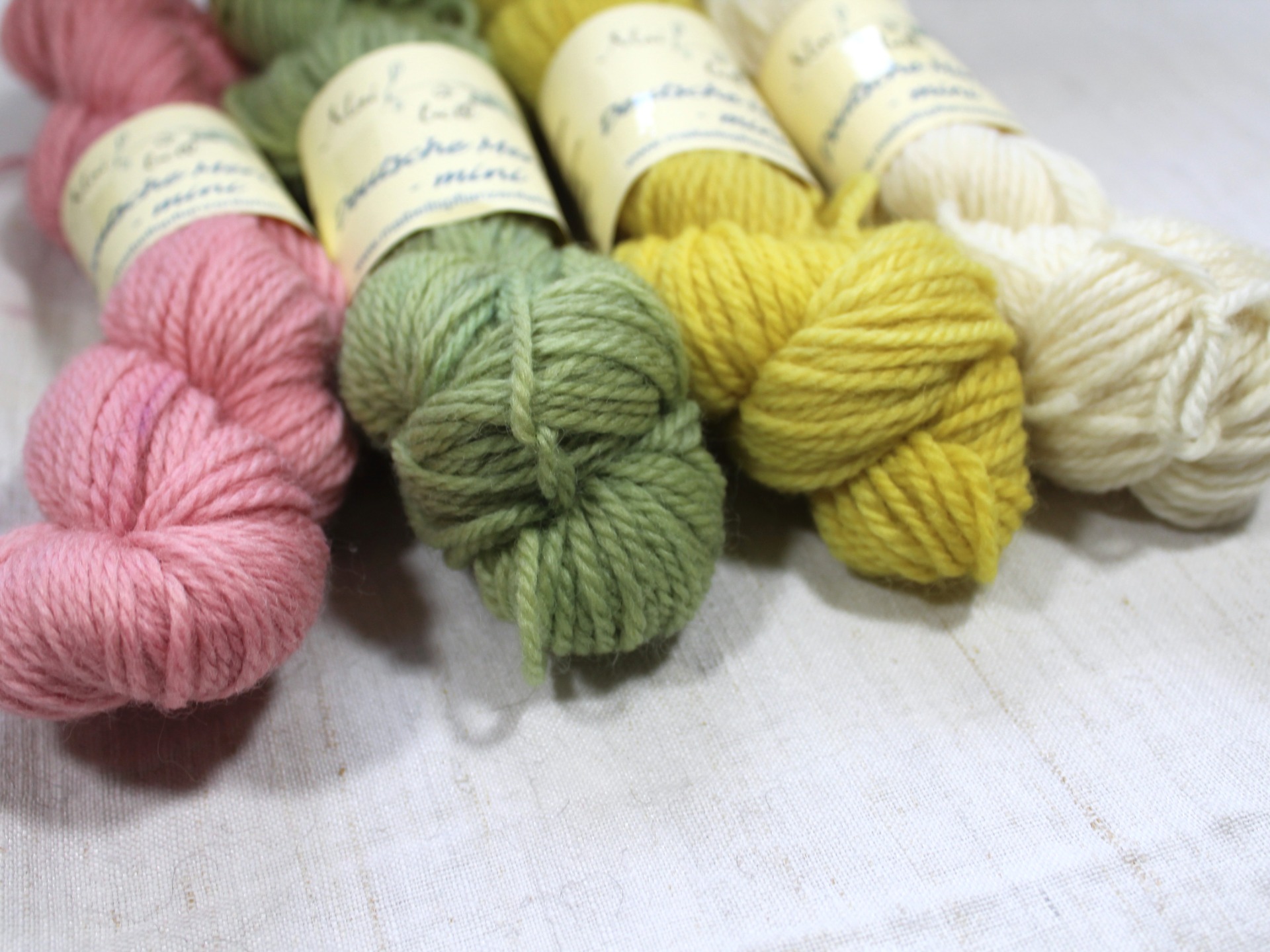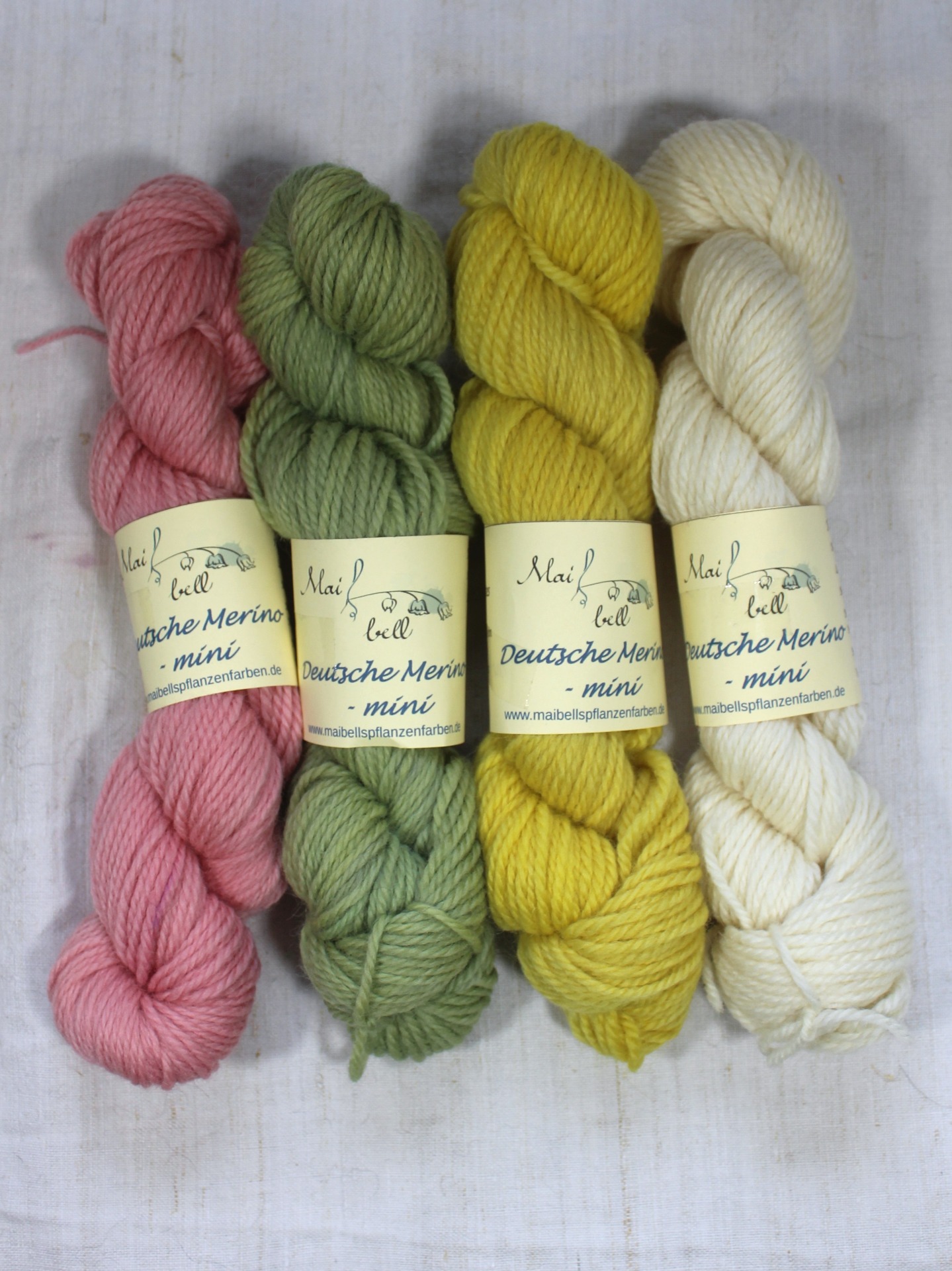 4 x 50 g Strang, gefärbt mit Sappanholz (pink), Weinlaub und Indigo( grün), Färberkamille (gelb) ungefärbt (cremeweiß)