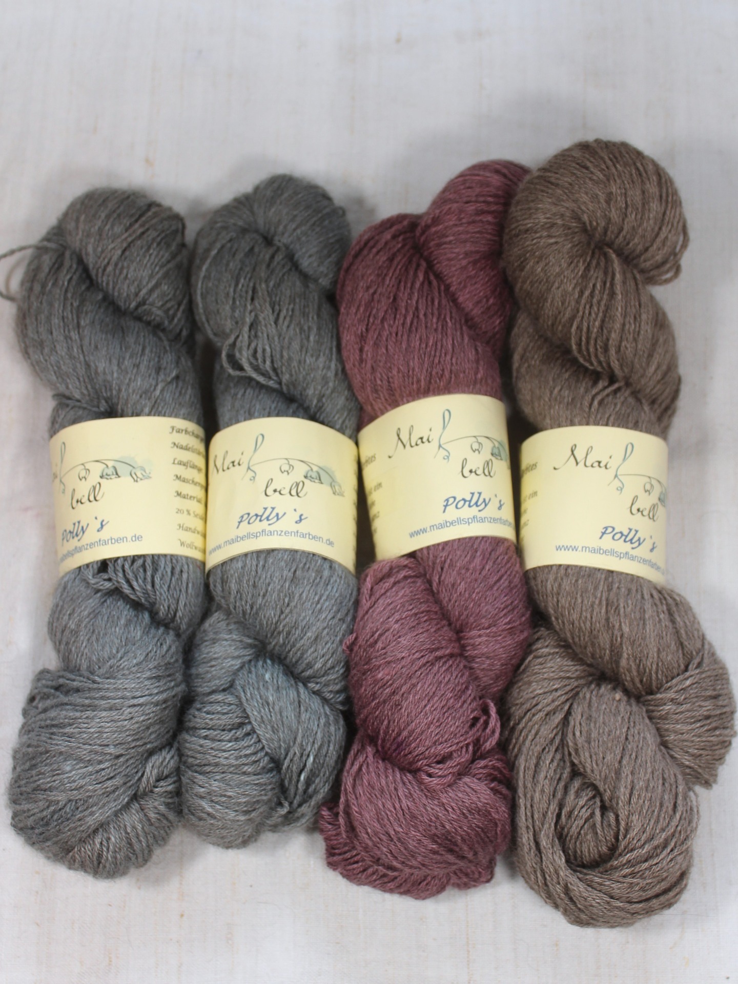 Das Set besteht aus 2 Strängen Stahlblau, 1 Strang Braun und 1 Strang Beere - je 100 g/ 400 m. Also eine Gesamtlauflänge von 1600 m